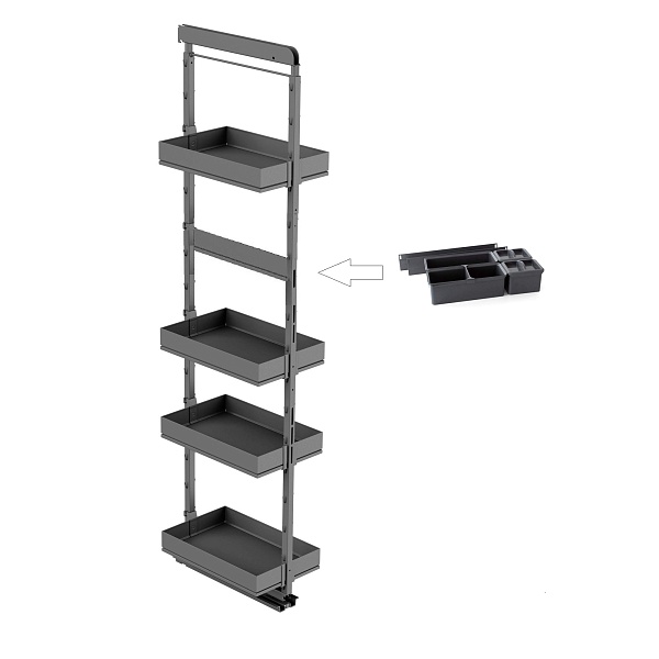 • Высокая нагрузка на механизм в 100 кг (по 18 кг на полку) позволяет организовать хранение большому количеству предметов, при этом даже при полной загрузке система выдвигается легко.