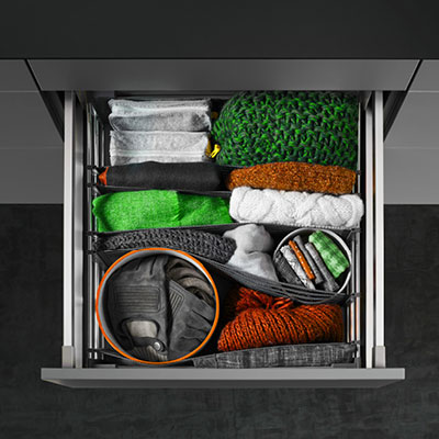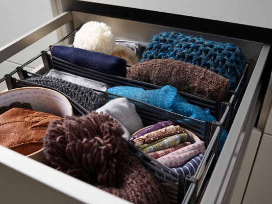 В гардеробной. Шарфы, шапки, платки, перчатки, ремни – с помощью SpaceFlexx они аккуратно разложены в ящике шкафа, не расползаются, не путаются, всегда доступны!